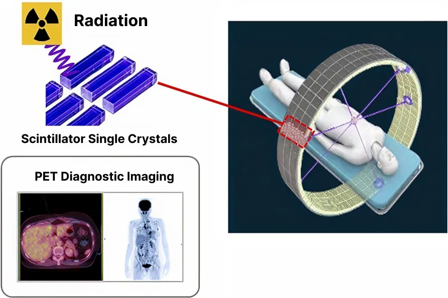 We independently develop and manufacture scintillator single crystals for PET scanners. These scintillator single crystals are critical materials that convert radiation into light, serving as components that determine the accuracy of the medical examination. PET scanner detects and images the faint radiation emitted by tracer drugs administered to the body to locate internal lesions. Our technology supports medical applications such as early cancer detection and dementia diagnosis.