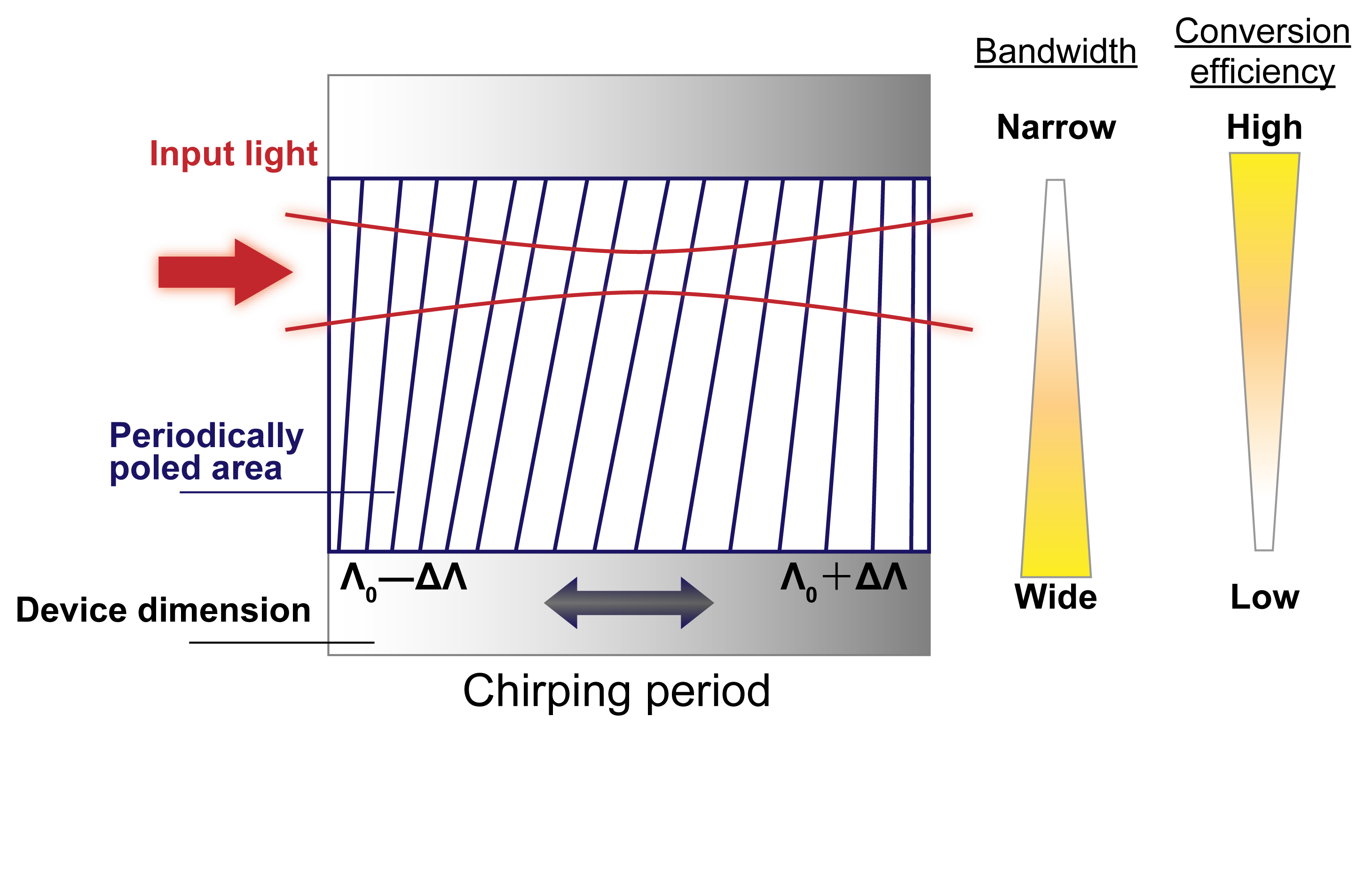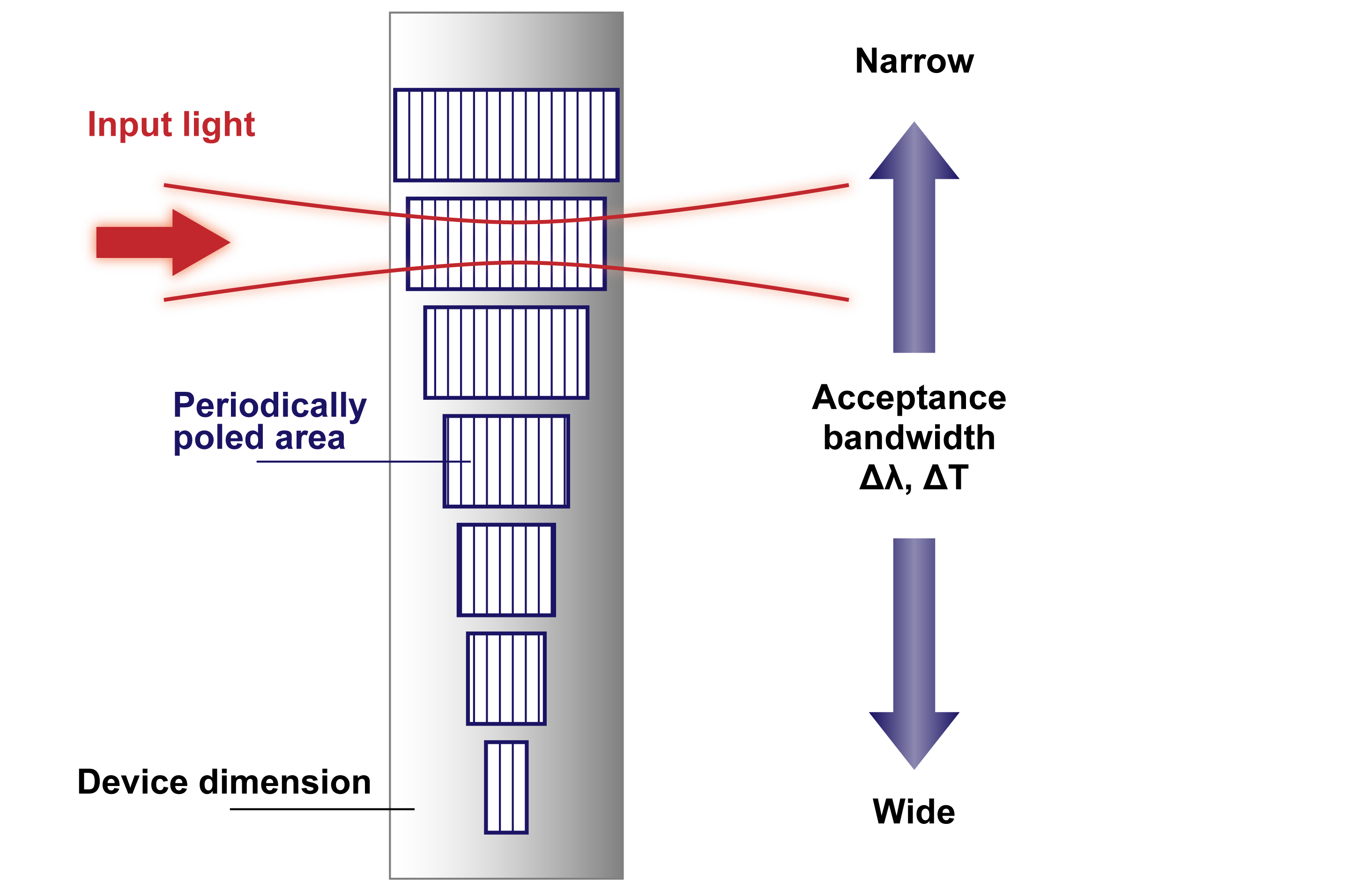 フェムト秒レーザや光コム、広帯域光源などにおいては、入射するレーザ光の波長帯域が一意に安定に定まらない場合があります。また、このような光の波長変換を行う場合、パワーとしての効率を優先すべきか、パルス幅や帯域を維持すべきか、なかなかパラメータを決めるのが難しい場合があります。そのような用途に対して、簡便に最適解を見出すことのできるQPMデバイスの設計がBandwidth selectableデバイスです。 波長変換のInteraction lengthのバリエーションを振る場合と、チャーピングを連続的に変化させた場合、いずれも入射‐変換光の波長帯域を任意に選定が可能となります。