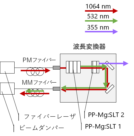 FBGタイプのCWファイバーレーザを基本波光源としたシングルパス構成による波長変換レーザ です。波長変換過程がシングルパスで共振器を構成していないため、環境が変動に対して安定 です。変換しなかった残留基本光は波長変換器(コンバーター)の外に排出されるため、コン バーターに大きな熱源がなく、計測装置などへ搭載する際、熱による擾乱や冷却ファン等によ る振動の影響を受けません。