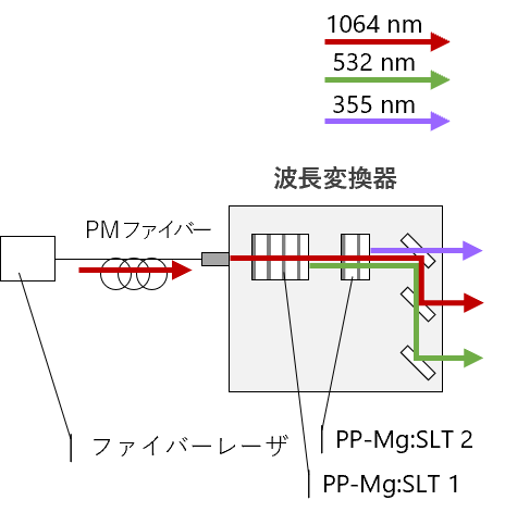 FBGタイプのCWファイバーレーザを基本波光源としたシングルパス構成による波長変換レーザ です。波長変換過程がシングルパスで共振器を構成していないため、環境が変動に対して安定 です。シングルパス構成において変換されなかった残留光を取り出すことにより、1つのコン バーターヘッドから、3波長出力する構成です。